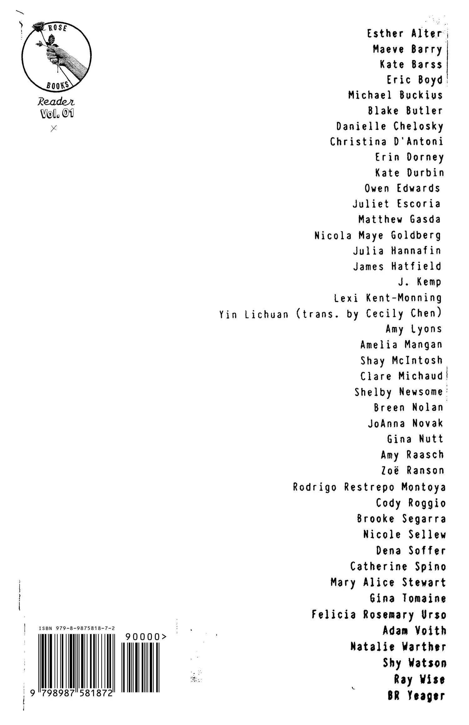 YOU'LL FEEL BETTER SOON in ROSE BOOKS READER VOL. 1: PRIMAL SCREAM WHAT I'D ASK IF YOU WEREN'T DEAD in SUICIDE: AN ANTHOLOGY COMPULSION in WITCH CRAFT MAGAZINE ISSUE #7 (OUT OF PRINT) WHAT I'D ASK IF YOU WEREN'T DEAD Hobart After Dark. WANTING NOTHING Hobart. BAR ROT Expat Press. ALWAYS AND FOREVER JUST ALMOST X-R-A-Y Literary Magazine. PURGATORY Mors Tua Vita Mea alumni tribute anthology for Giancarlo DiTrapano, Neutral Spaces.